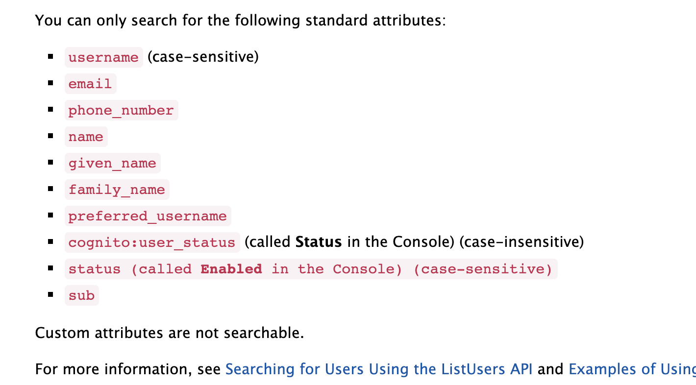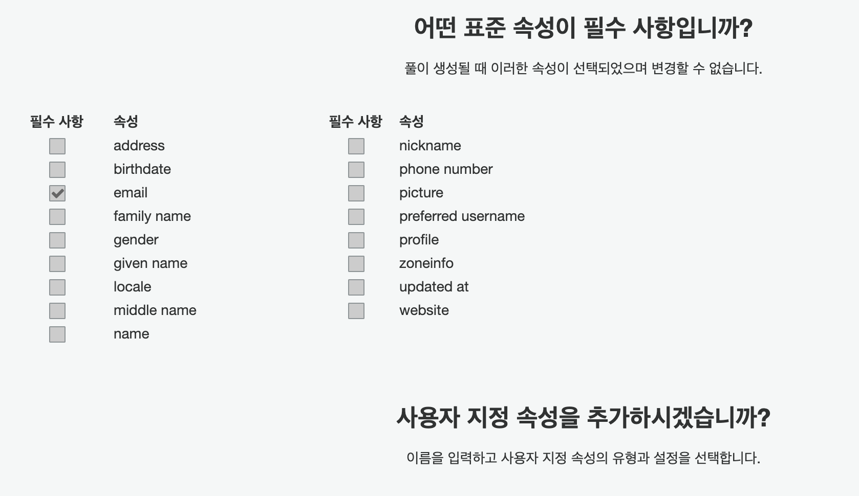 Cognito 는 회원가입을 할 때 다양한 속성들을 폼에 입력받아 저장할 수 있다. Cognito 에서 지원하는 속성들은