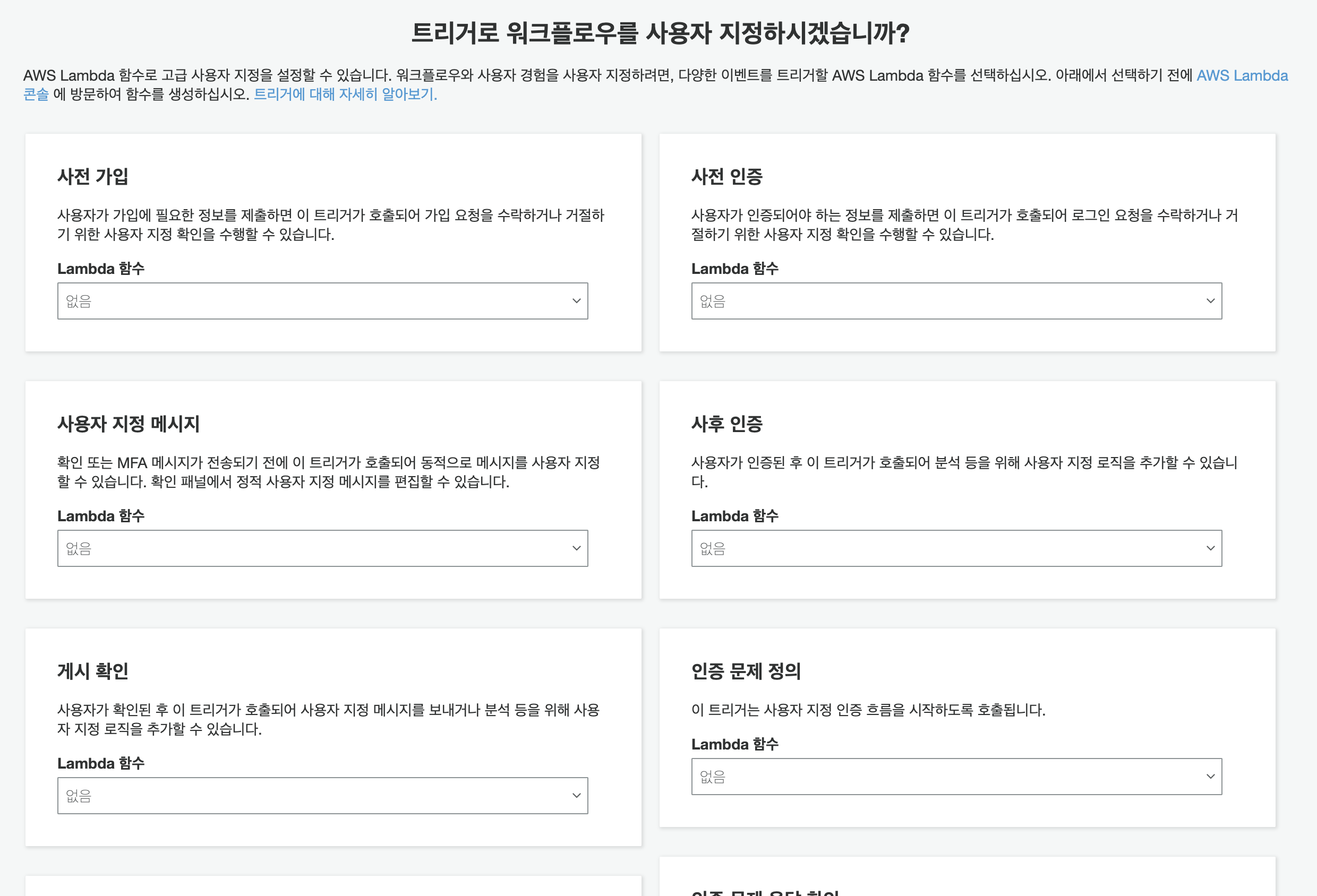 Cognito 에서 사용할 수 있는 트리거의 종류는 사전가입, 사용자 지정 메시지, 사전인증, 사후인증 등 여러가지가 있습니다.