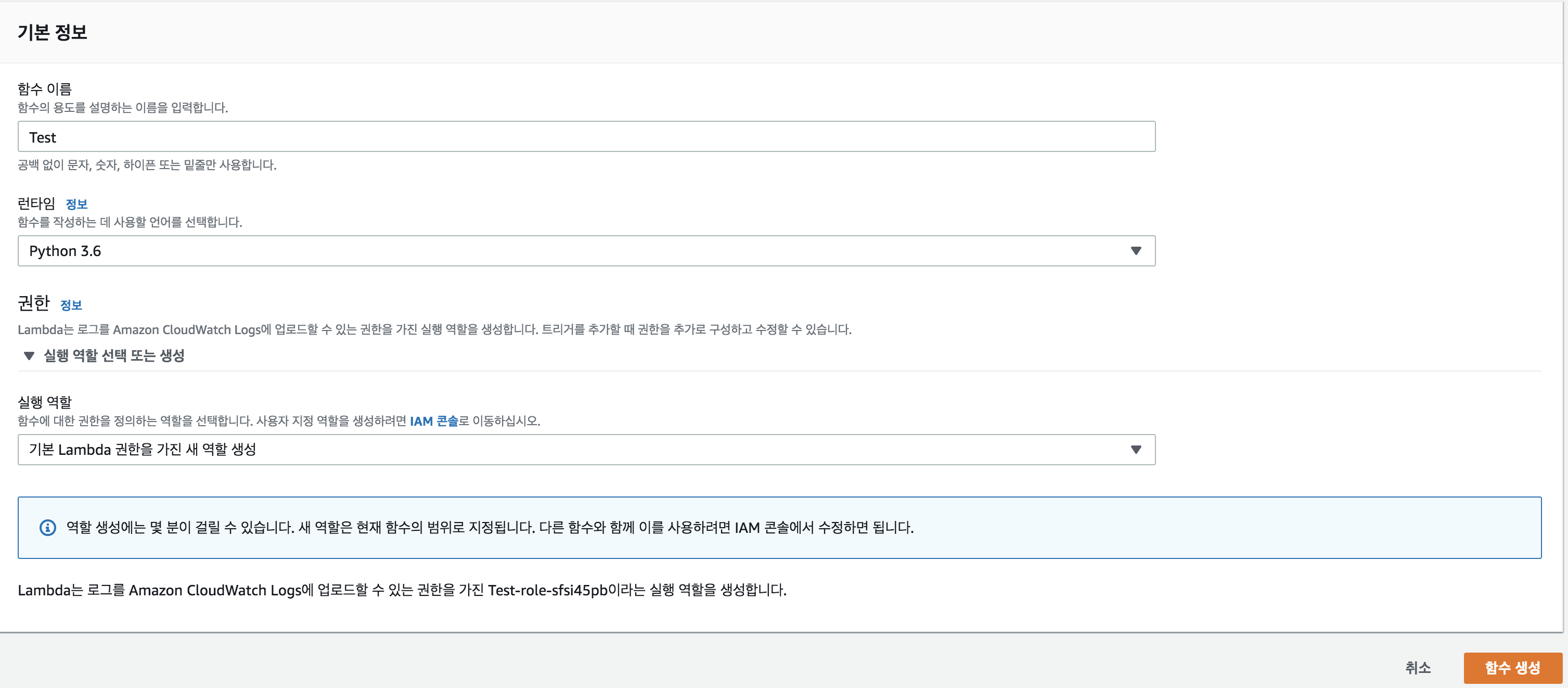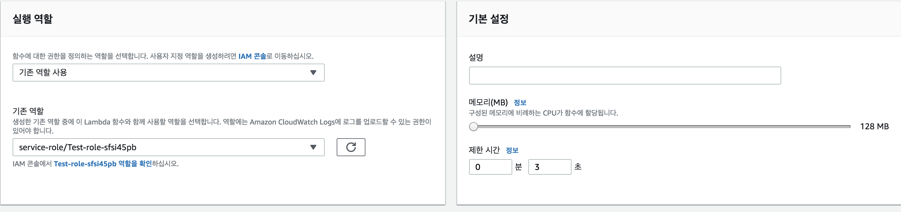 이 곳은 실행 역할(권한) 과 사용할 메모리, 제한 시간을 설정 할 수 있습니다