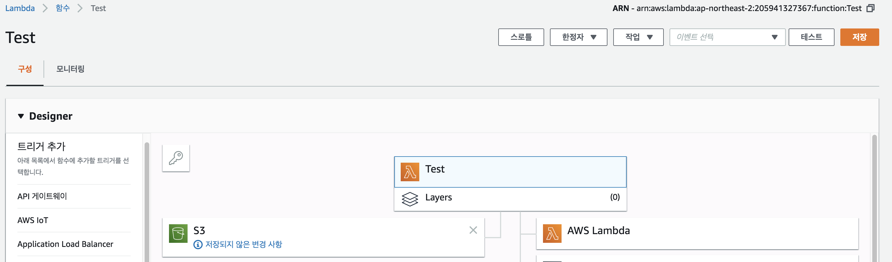 설정해준 역할(권한)이 잘 적용된걸 람다 함수 오른쪽을 보시면 알 수 있습니다