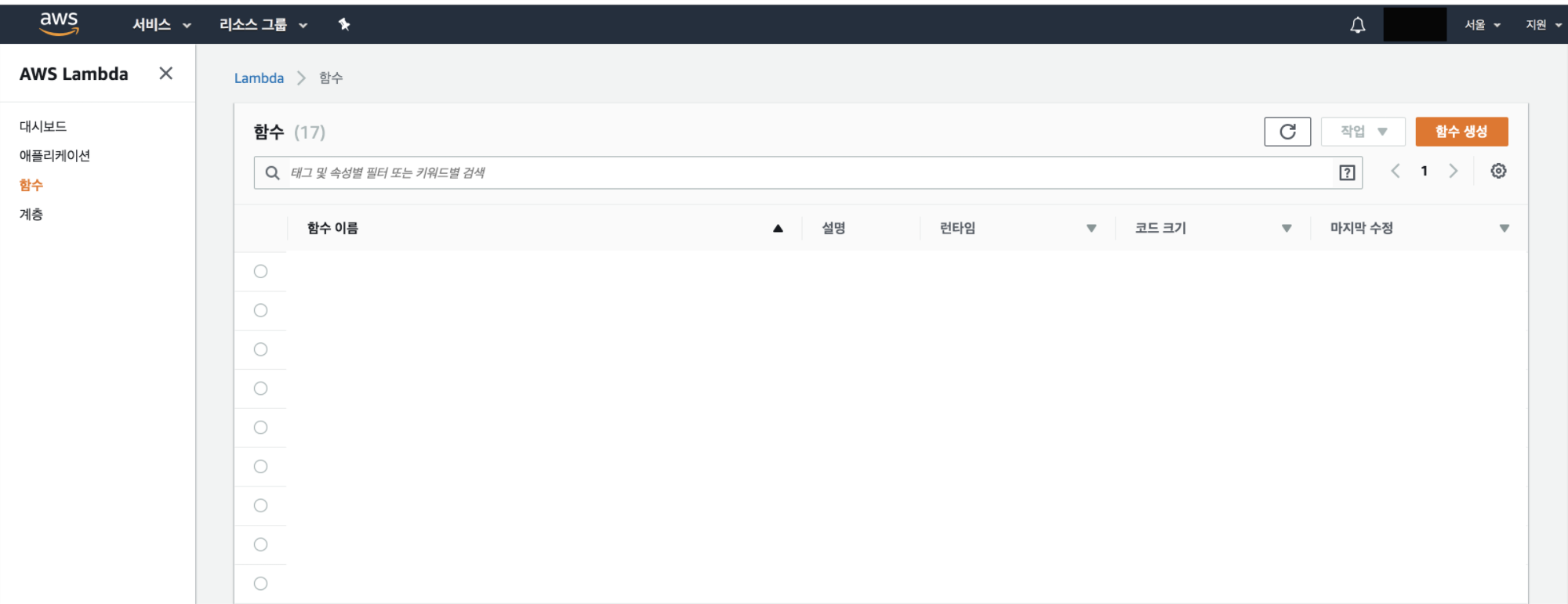 AWS Console -> Lambda 로 들어가면 보이는 페이지입니다